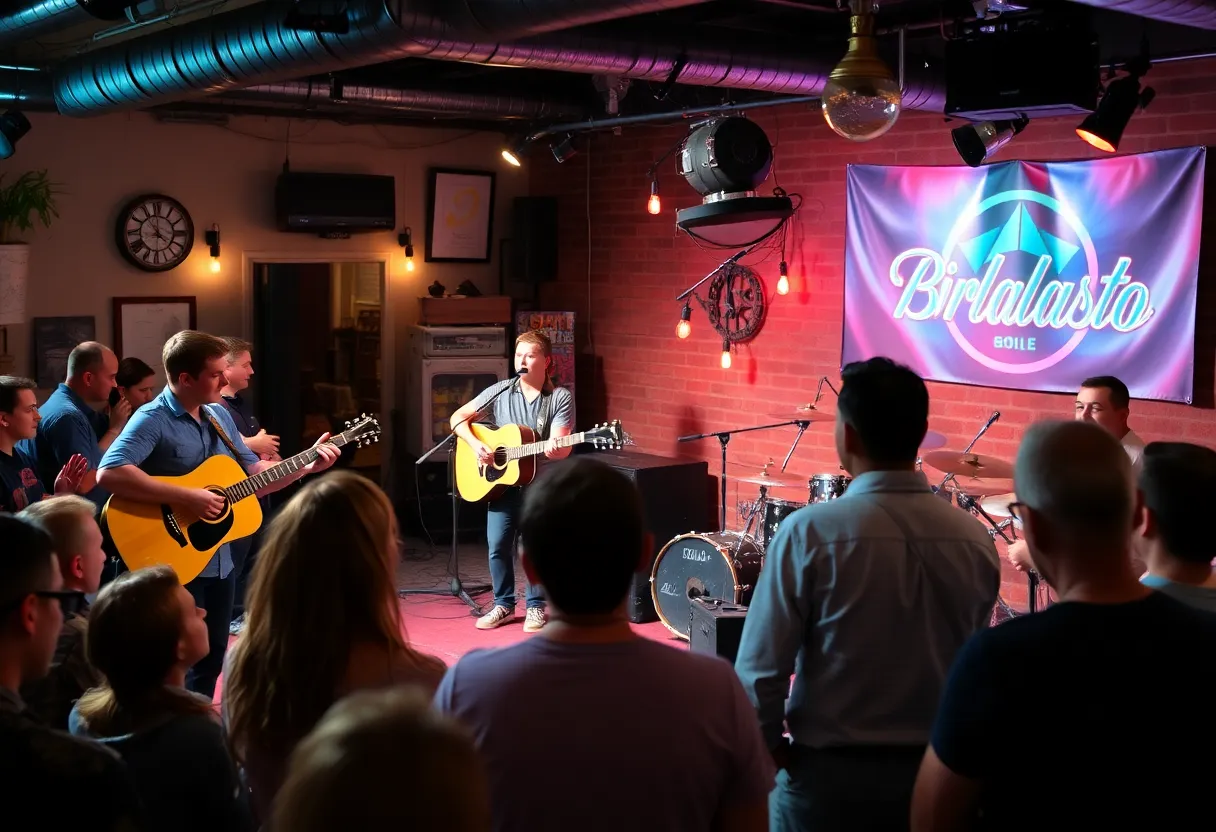 Live performance of a local musician on stage with an audience in a cozy venue.