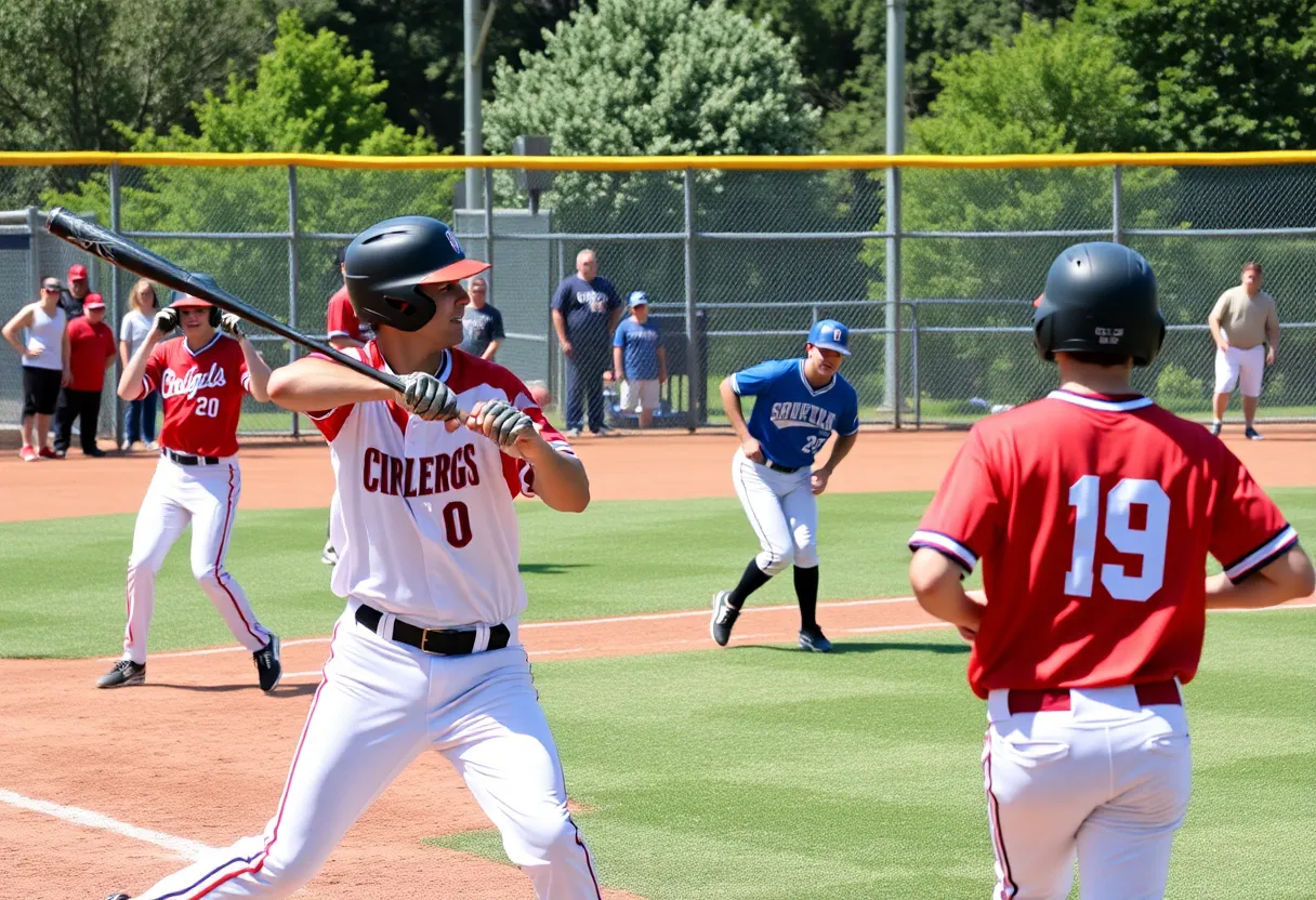 Action shot of Ole Miss and Mississippi State baseball players during a game.